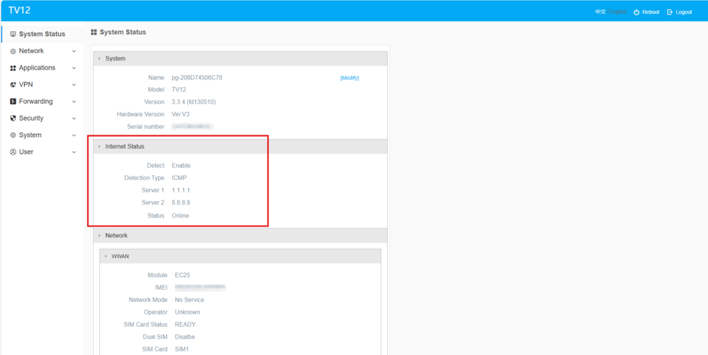 7. After settings change applied, modem/router will reboot. Login again to check System status. Internet Status should now say Online.