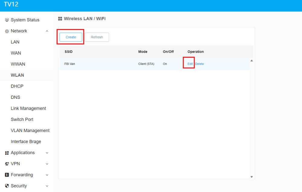 5. From the main menu go to Network > WLAN. Select the Create button to add or select the Edit option of an existing SSID for configuration.