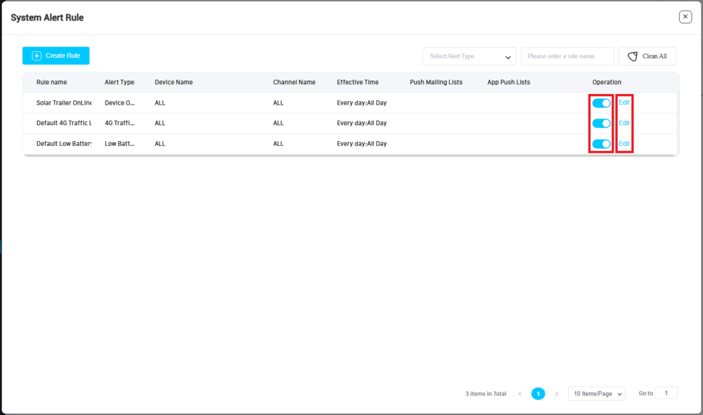 Enable the sliders under Operation for the rules you want to get alerts for.