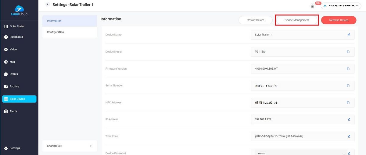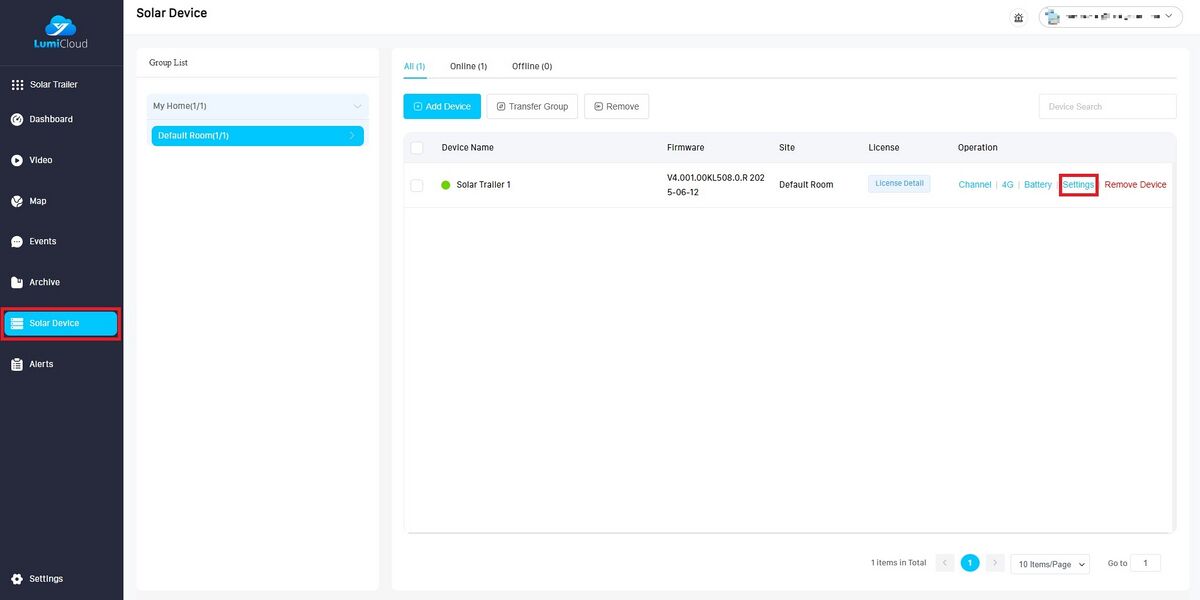 1. Log into the user account that has the LumiGuardian Solar Trailer added to it.