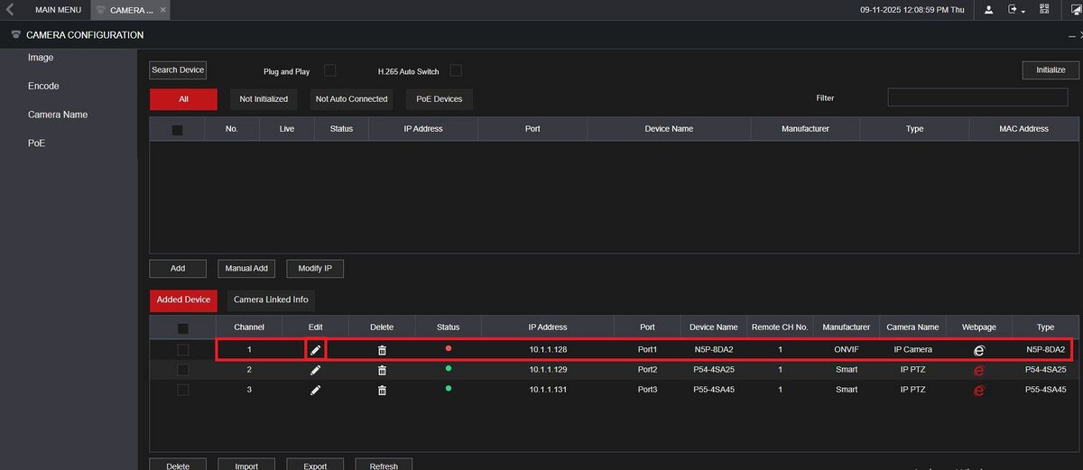 9. If the camera is connected correctly, the red dot should change to a green dot under Status for the camera.