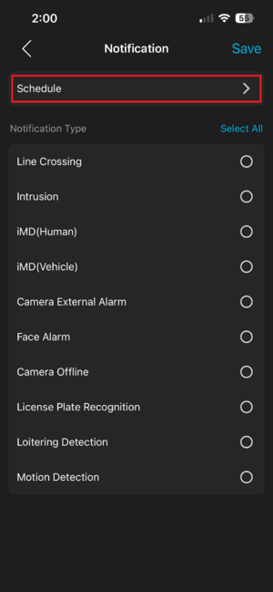 4. If you do not want to receive notifications for this camera 24/7, you can tap the schedule option at the top and set a custom schedule for this specific camera. In the schedule option, tap the time bar for the day to modify it as needed, and hit Save.