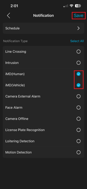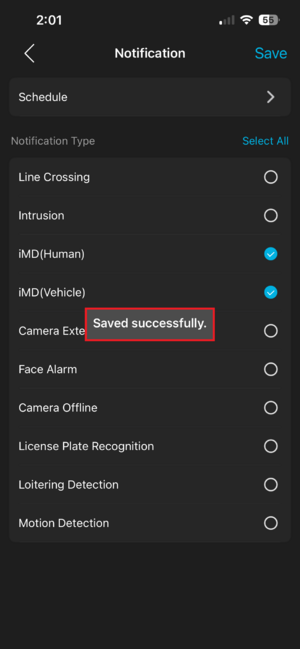 5. Once that is completed, or if you do not need to modify the schedule, select the type of notifications you wish to receive for this camera, and hit Save. You will receive a pop up confirming it has saved successfully. From there, you can go back to the camera list, and repeat these steps for any other cameras you wish to receive notifications for.