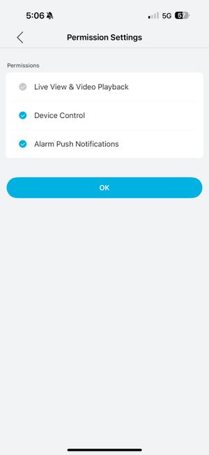 6. Next you will be asked to choose what type of permissions you want to provide for the user. You are required to provide live view and video playback permissions, but Device Control and Push Notifications are optional. Select what you require, and tap Ok.