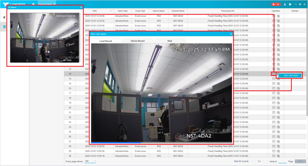 11. In the LumiViewer Event Records list, you can click the small image icon to the right of the event to see a snapshot of the event trigger, or you can click on the film reel icon to select the recorded video source and review video footage of the event.