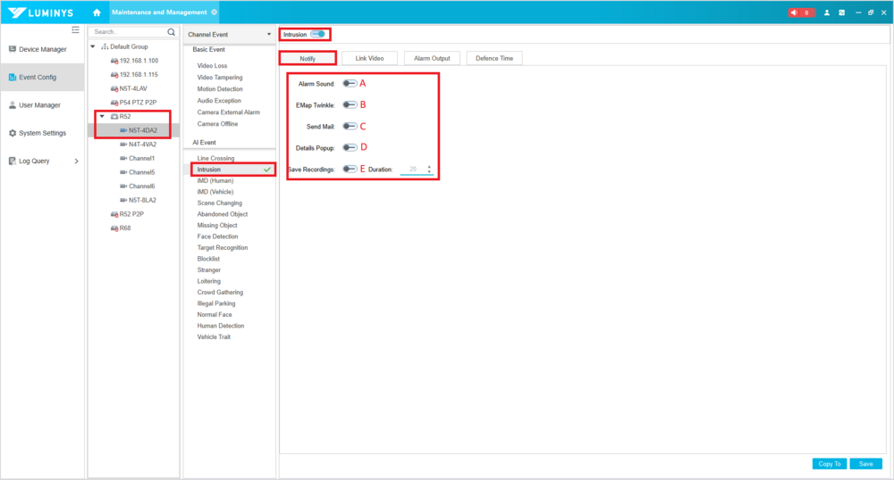 2. In the Event Config window, select the device (channel) you want to monitor for events, and then select the event type you are trying to set up. Enable the event at the top, and then set your preliminary event parameters under the Notify tab, and click Save when you are finished.