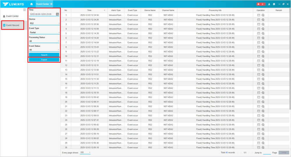 10. You can also search a historical list of events using the Event Record page. Select it on the left, and set your search terms. Once set, click Search and you will see a log of your events. You can also export the event logs using the Export button. The export does not contain video footage, it is an Excel file with text logs only.