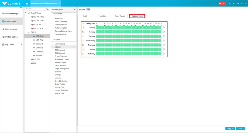 5. To set the timeframe the rule is active, select the Defense Time tab at the top. You can modify the schedule to dictate what day/time LumiViewer will trigger the events. Note that like our other settings, this does not have an effect on the recorders local event triggers/recordings and is specific to LumiViewer. Save the settings when you are done.