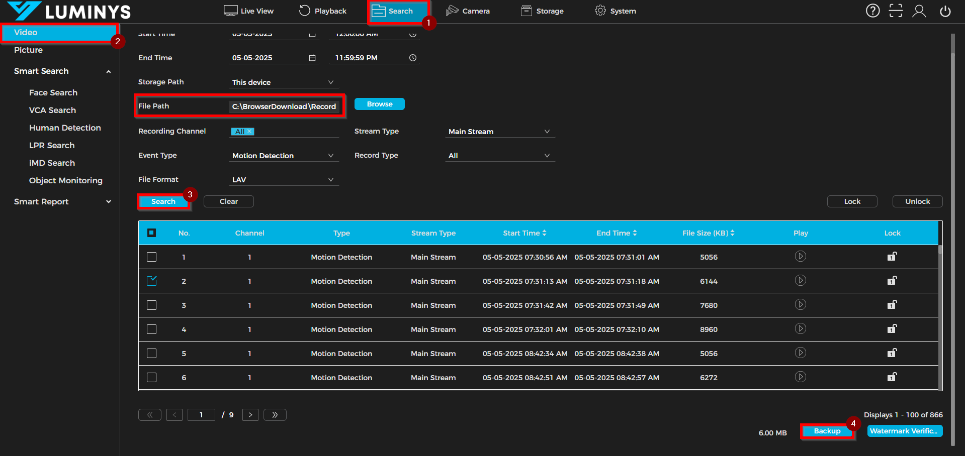 Once the relevant video clips are identified, select the required files and activate the Backup function at the bottom of the interface to initiate the download procedure.