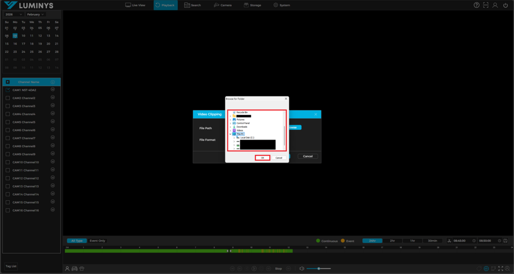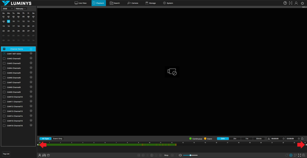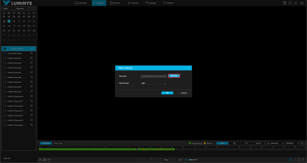 1. Start by logging in to the recorders WebUI from any browser, and select the Playback menu at the top. Select the camera you wish to back up, and click the Scissors (Video Clipping) button in the bottom right. Note that you can only backup one video channel at a time via playback.