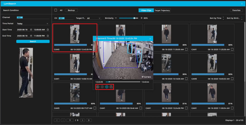 1. To view a LumiSearch result, simply double click on it to open a playback window for the event. Below the video you have options to pause, stop, hide/show AI rule, and another LumiSearch button.