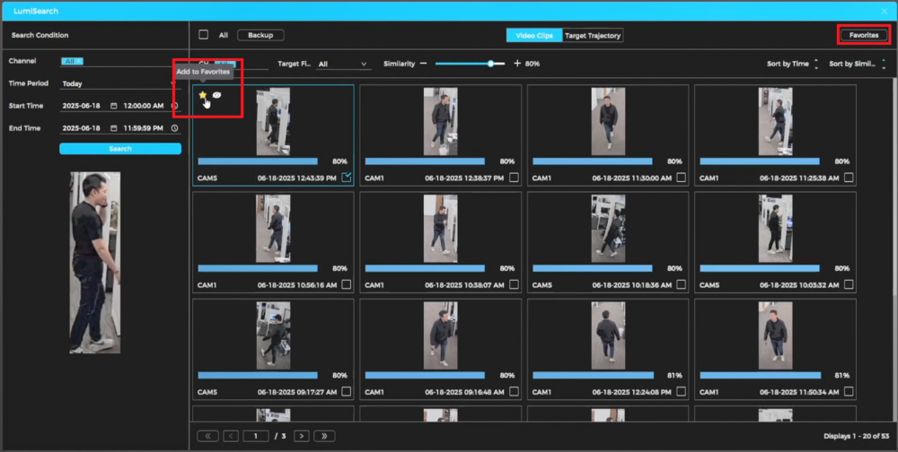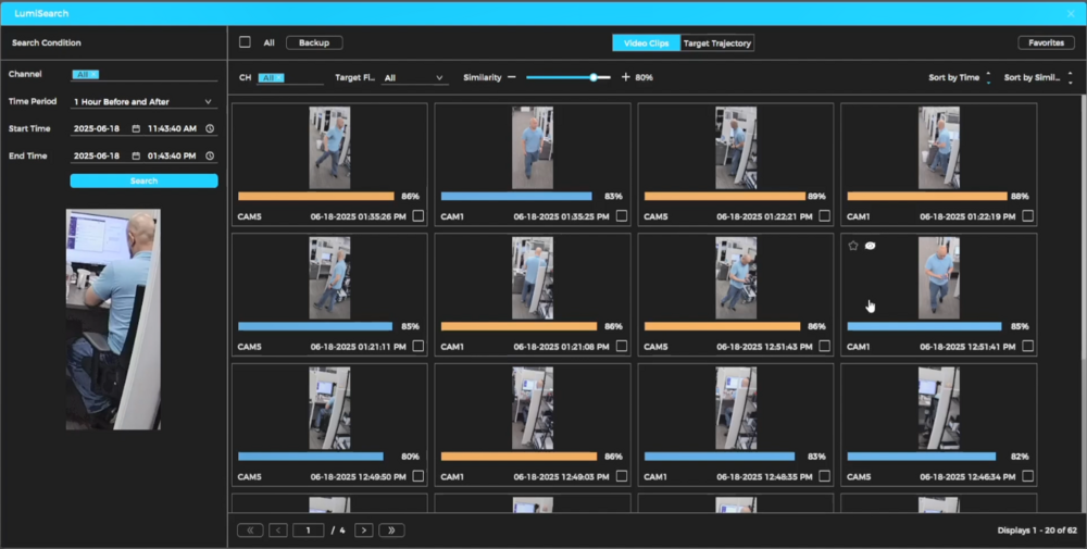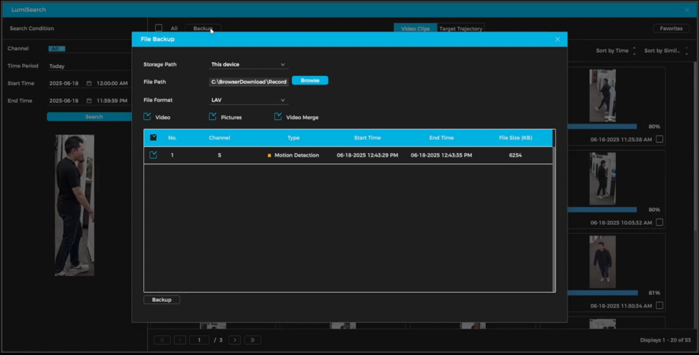 5. As with the other LumiSearch methods, you also have the option to play individual events, Favorite, or Hide using the icons to the right of each clip in the list of events. You can also select event clips and save them by clicking the Backup button.