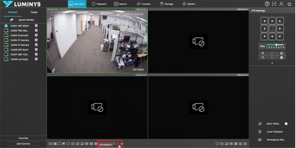 1. To search by area, start by clicking the LumiSearch button at the bottom of the Live View. Unlike searching by target, you do not need a target in frame to use the Search By Area feature.