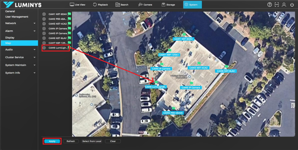 1. To start, open the recorders WebUI and go to the System > Map menu, and select the “Select from Local” button. This will open a file browser to select your saved image and upload it to the recorder. Of note, you can only have one image per recorder so make sure it covers the entire area.