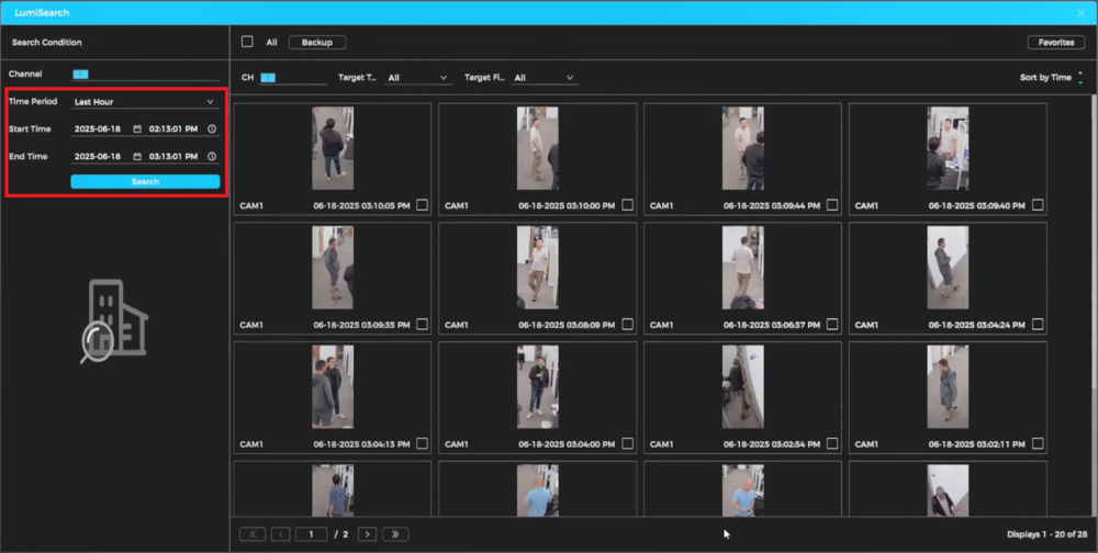 3. The Search by Area function will default to searching the defined area for any targets within one hour before and after the time of the video and present them to you. You can modify the date and timeframe for the area with the search settings on the left, but you cannot modify the channel, since the search is specific to the defined area.