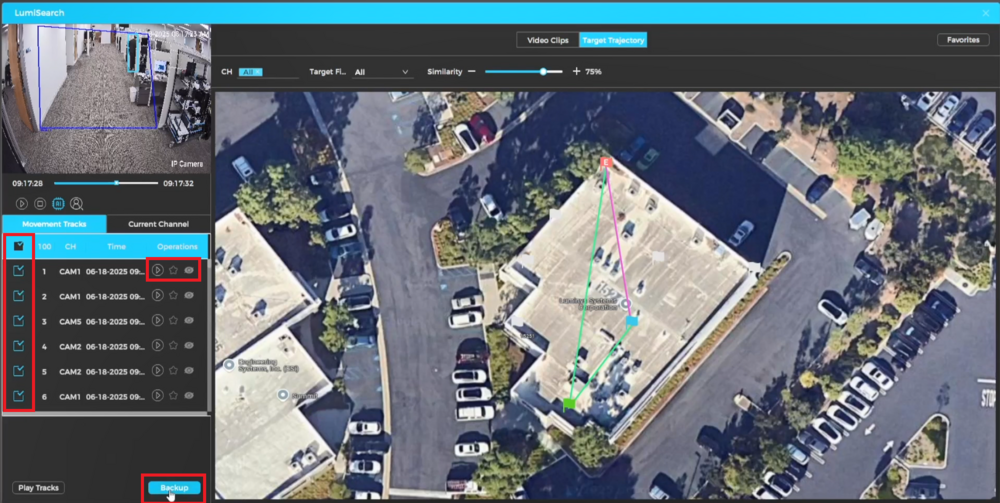 3. Now that your cameras are mapped, return to the Live View tab. Now, when we use the Search By Target function of LumiSearch the results will have a Target Trajectory option at the top which will show our targets movement on the map and event clips. We can select which clips we want to view, and click Play Tracks to play them in order, which will also provide a “Play by Play” on the map.