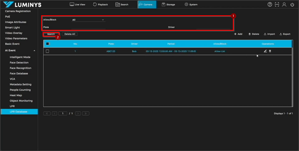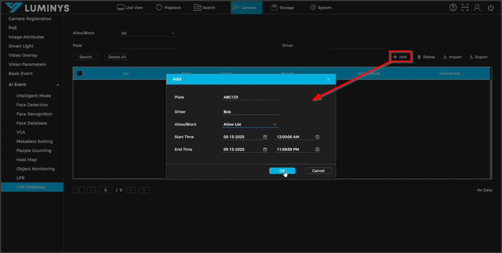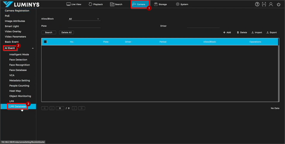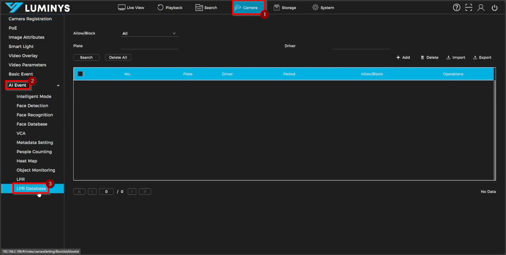 1. To add license plates on the NVR, navigate to Camera > AI Event > LPR Database.
