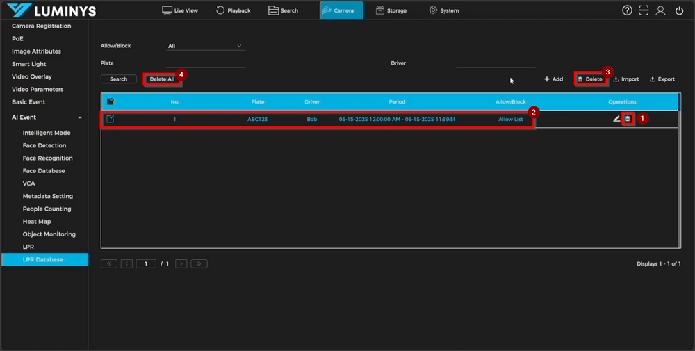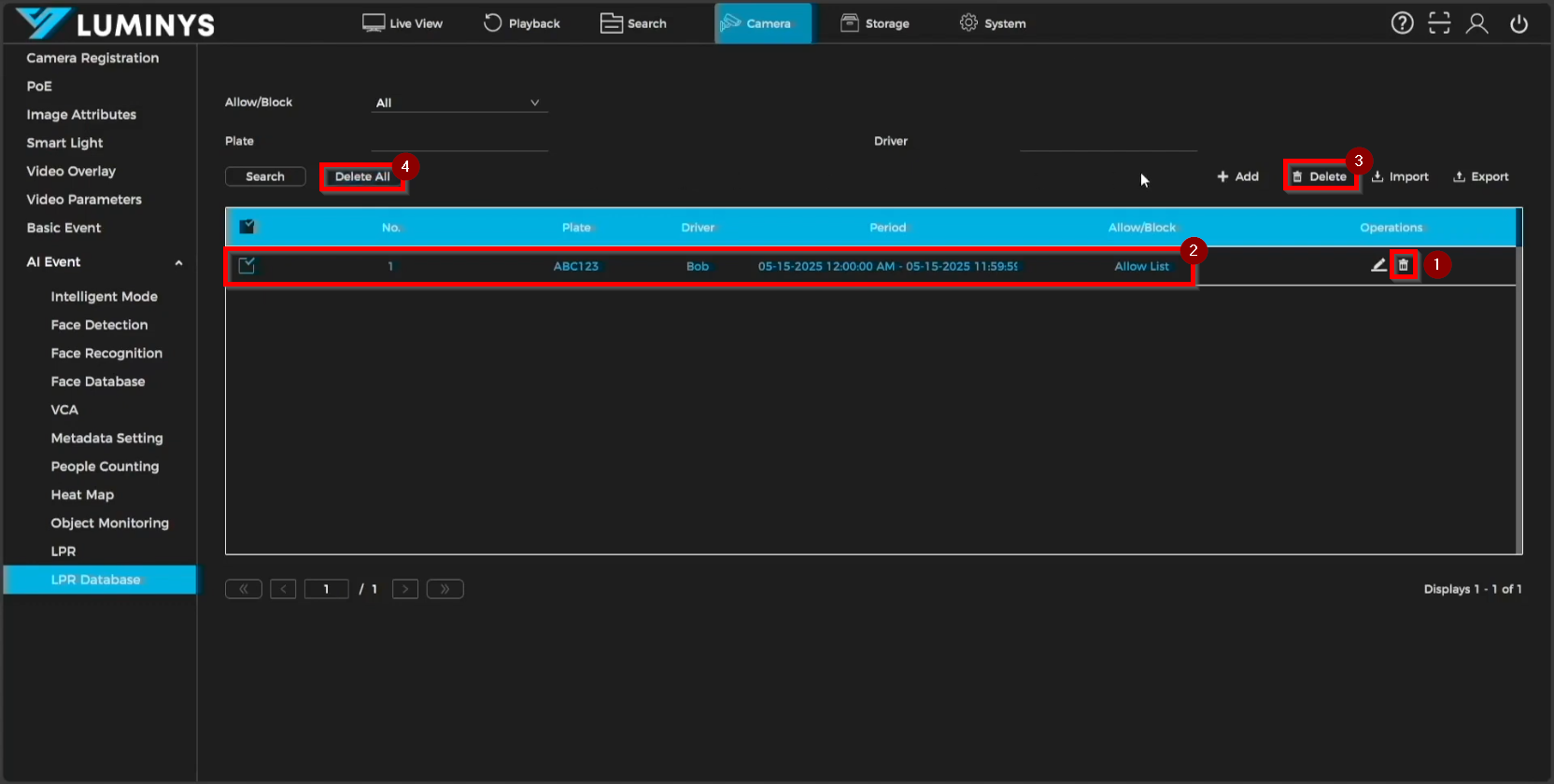 4. To delete a specific license plate, click the trash can icon (#1) next to the corresponding entry. To delete multiple license plates, select the desired entries and click the Delete icon (#3). To remove all license plates from the database, click the Delete All button.