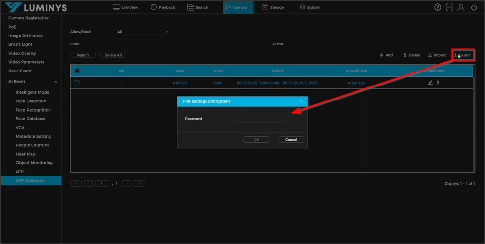 5. License plates can be exported from the NVR, and a password must be entered to encrypt the exported file.