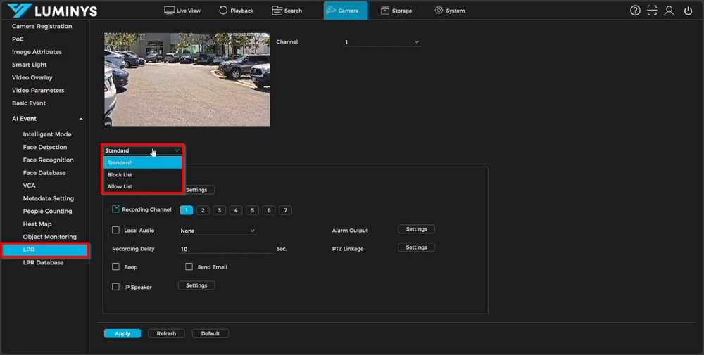 6. To apply the Allow/Block list license plates, navigate to the LPR tab on the left side panel. Three options are available: Standard for general license plates, Block List for license plates that are not permitted, and Allow List for permitted license plates.